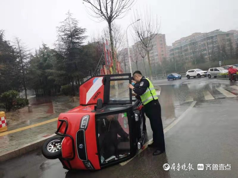 3月11日上午11时许,菏泽交警郓城大队一中队民警李斯、董再柯像往常一样在路面巡逻执勤,他们途经胜利街与盘沟路交汇处时,发现一辆红色电动三轮车侧翻在路边,民警立即上前查看。