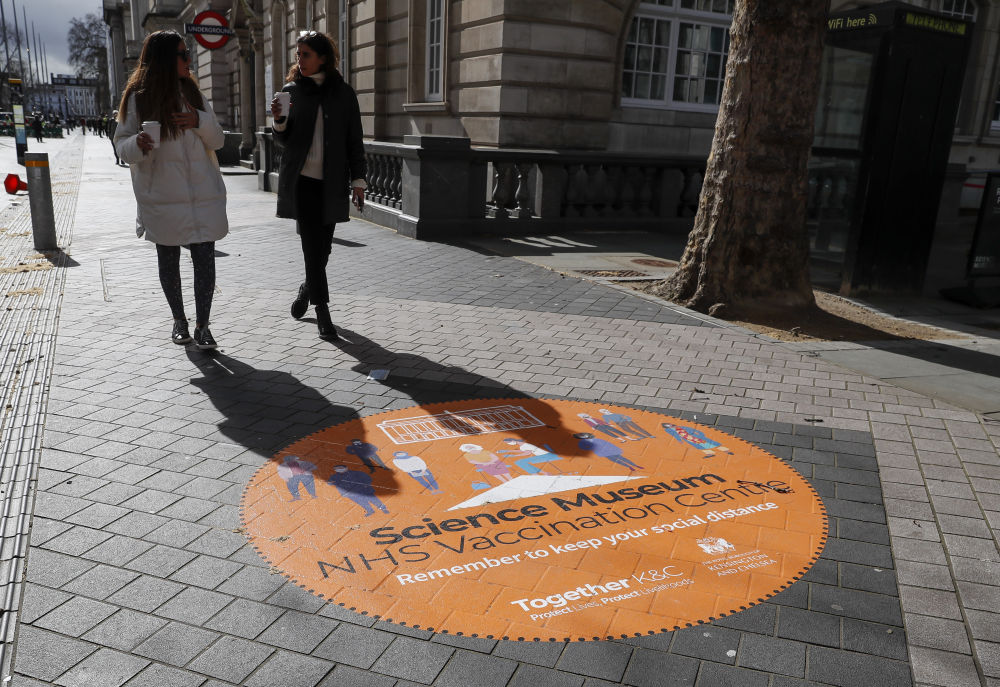 3月11日,人们从英国伦敦的科学博物馆改造的新冠疫苗接种中心附近路面上的标识旁走过。新华社记者 韩岩 摄