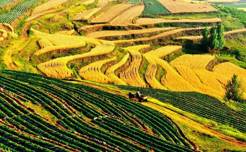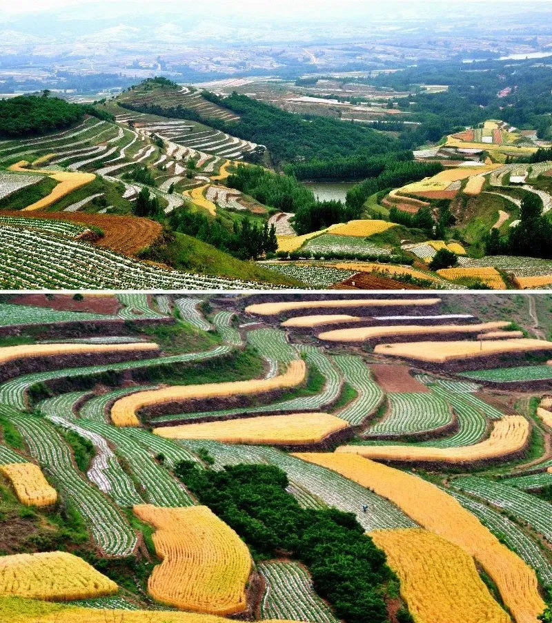 安丘市吾山镇,群山竞秀,绿树环抱,这里的梯田就像颜料盘洒落在了这片山地丘陵上。形状万千,层层叠叠,雄伟壮丽,气势磅礴,既壮观又秀美。