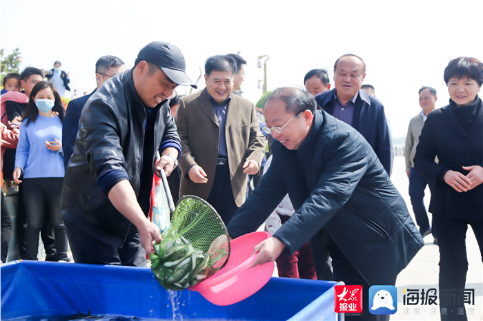 为加快单县公共水域渔业资源修复与生态养护,不断改善水生态环境,弘扬渔业文化,促进可持续发展,3月28日,单县举办“碧水蓝天,鱼跃古泽”2021年单县浮龙湖增殖放流活动。菏泽市水产服务中心党组书记、主任刘祥德,市水产服务中心渔业科科长王学成、李建立,单县政府党组成员瞿孝坤及相关单位负责人、学生代表、群众代表参加活动。