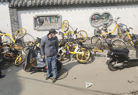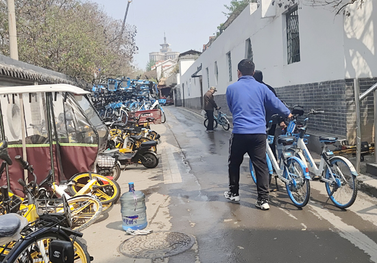 假期过后,黑虎泉东南门附近的一条街上,共享单车被堆积如山