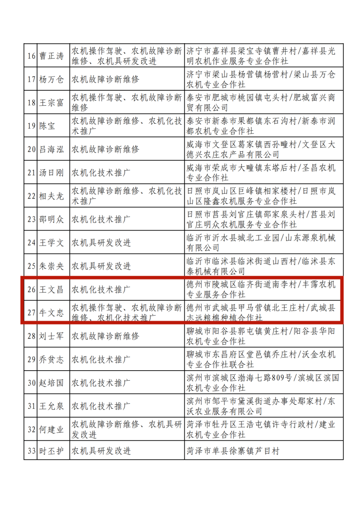 4月6日,山东省农业农村厅公示了全省农机使用一线“土专家”遴选结果,拟推荐济南市商河县玉皇庙街道办事处玉皇庙西村村民崇峻等33人作为全省农机使用一线“土专家”。德州市共有两人入选,分别为陵城区临齐街道南李村村民王文昌与德州市武城县甲马营镇北王庄村村民牛文忠。