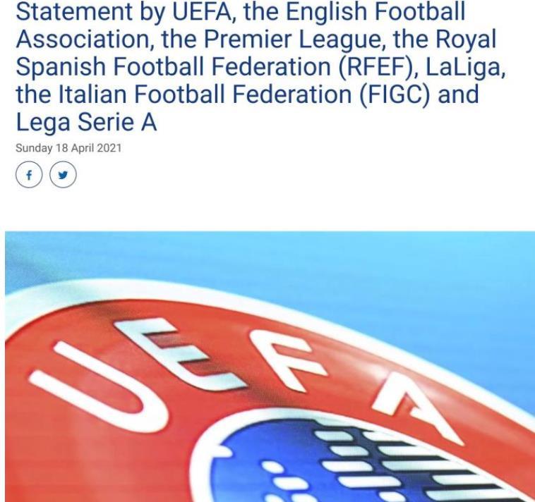 而就在前一天(18日),欧足联以及英足总、英超联盟、西班牙足协、西甲联盟、意大利足协、意甲联盟发布联合声明,明确表示反对超级联赛的成立。