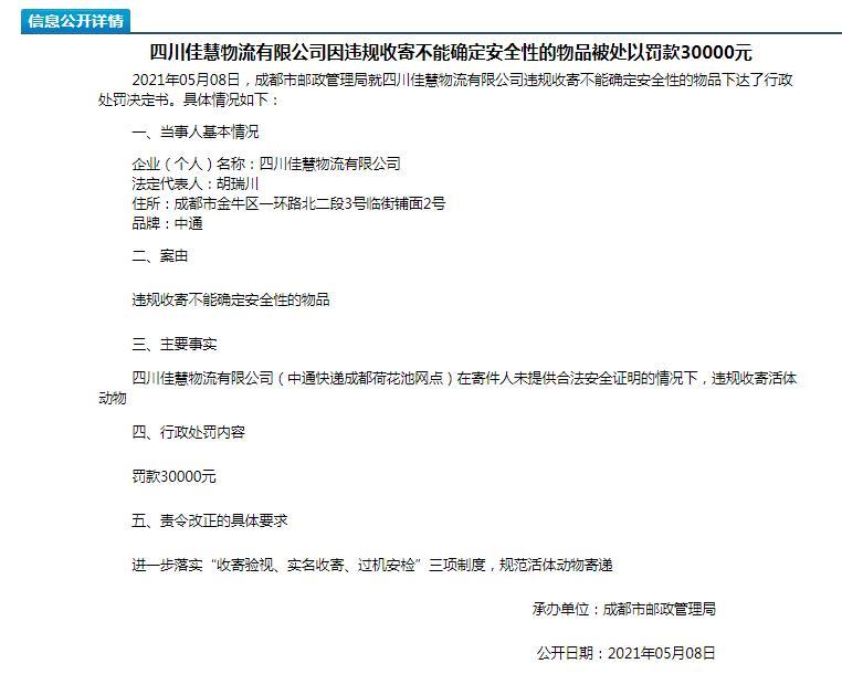 根据成都市邮政管理局网站8日披露的两则处罚公告显示,四川佳慧物流有限公司(中通快递成都荷花池网点)在寄件人未提供合法安全证明的情况下,违规收寄活体动物,被罚款30000元。此外成都市邮政管理局责令该公司进一步落实“收寄验视、实名收寄、过机安检”三项制度,规范活体动物寄递。