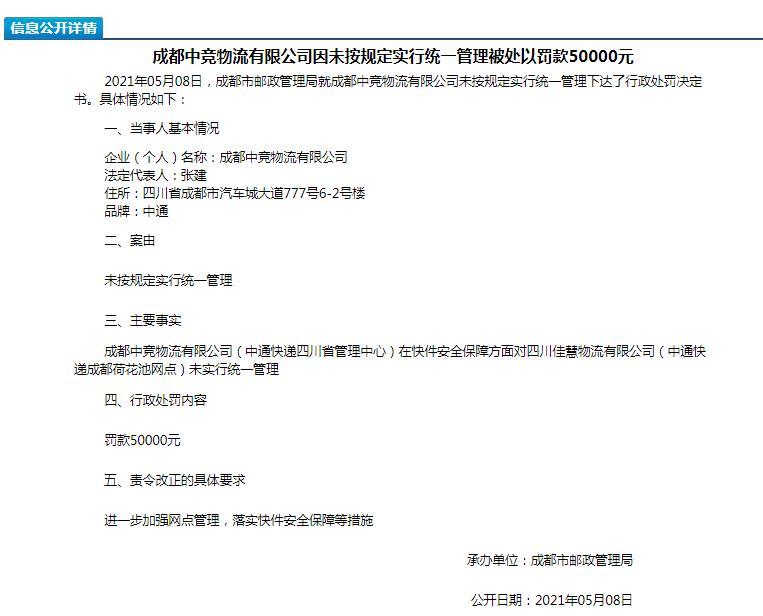另一则公告显示,成都中竞物流有限公司(中通快递四川省管理中心)在快件安全保障方面对四川佳慧物流有限公司(中通快递成都荷花池网点)未实行统一管理,被罚款50000元。此外,成都市邮政管理局责令该公司进一步加强网点管理,落实快件安全保障等措施。