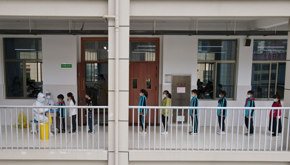 5月17日,在六安市清水河学校第二小学,检测人员为学生做核酸检测(无人机照片)。新华社记者 周牧 摄