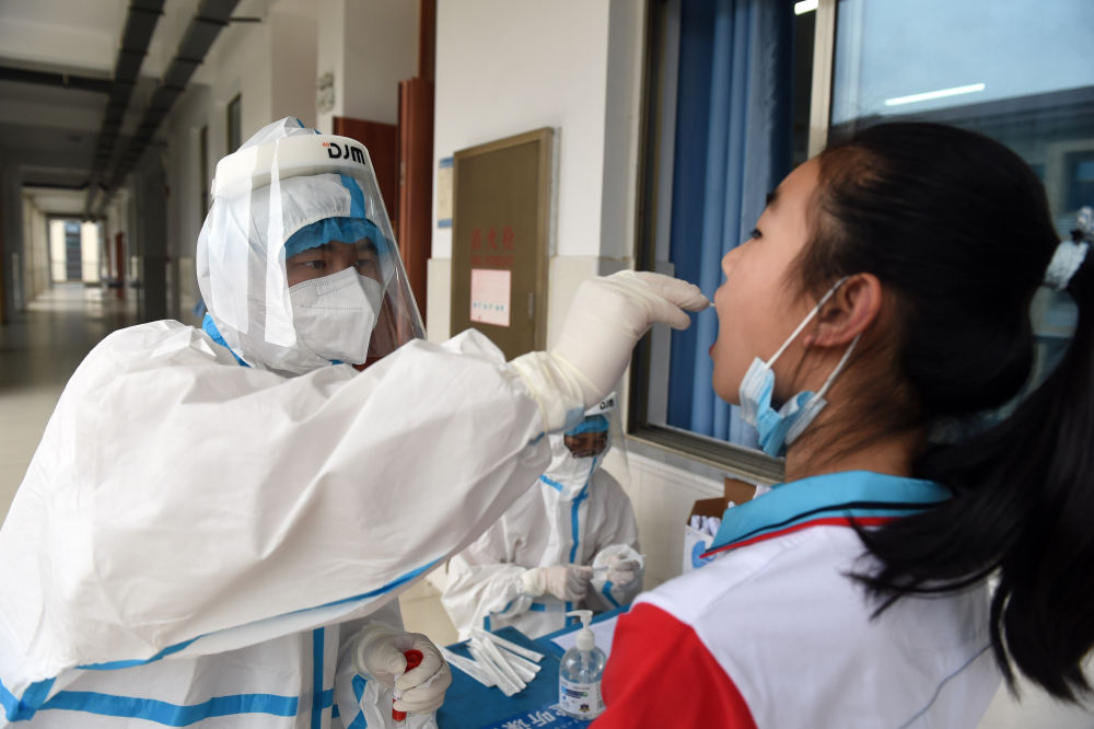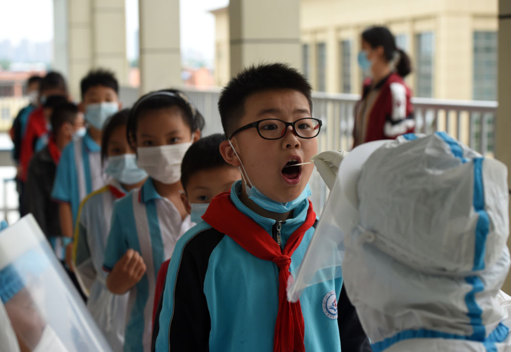5月17日,在六安市清水河学校第二小学,检测人员为学生做核酸检测。新华社记者 周牧 摄