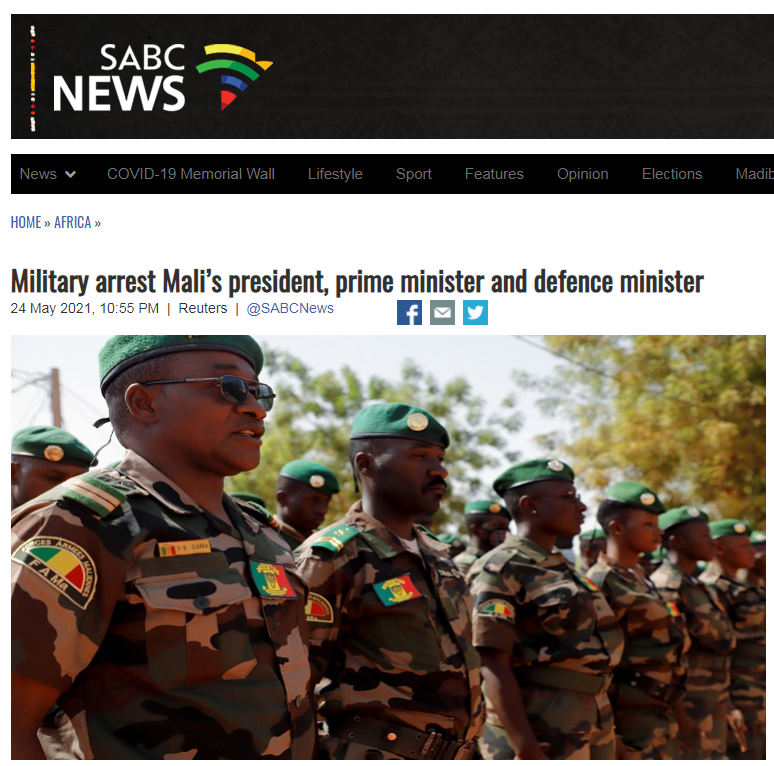 据南非国家广播公司当地时间5月24日报道,西非国家马里的军方于当日逮捕了该国过渡政府总统、总理和国防部长,随后将这些人员带到首都巴马科附近的一个军事基地。