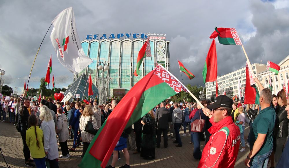 2020年8月27日,在白俄罗斯首都明斯克,人们参加支持总统的集会。(新华社发)