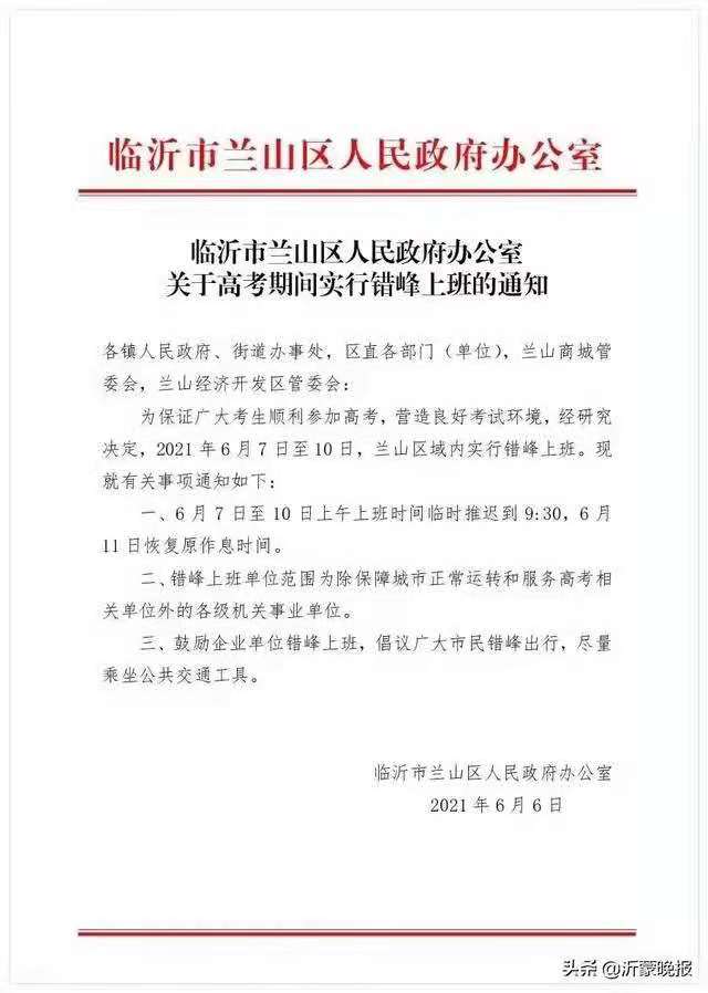 为保证广大考生顺利参加高考,营造良好考试环境,经市政府研究决定,2021年6月7日,奎文区、潍城区、坊子区、寒亭区、高新区区域内实行错峰上班。现就有关事项通知如下: