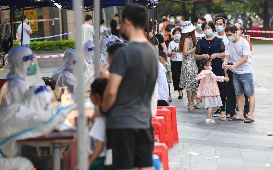 6月8日,在被列为高风险地区的广州荔湾区白鹤洞街广钢新城,居民有序排队等待核酸检测。新华社记者 邓华 摄