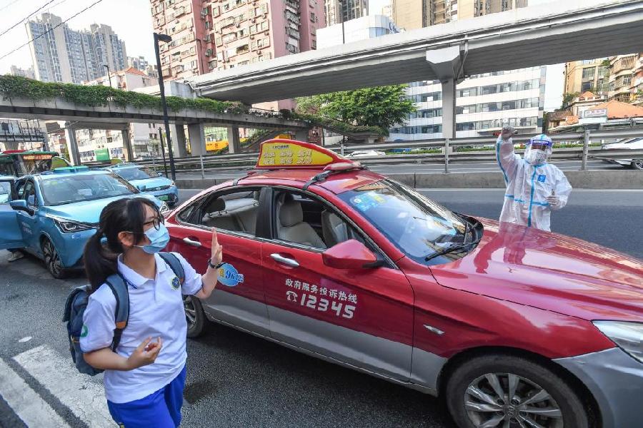 6月7日,一名来自真光中学的考生由广州市组织的专车一人一车送至广州市第一中学考点参加高考。广州市交通运输部门安排800多辆出租车、10辆大客车,分级分类做好需要进出荔湾区封控区域和中、高风险区域考生的接送服务。新华社记者 刘大伟 摄