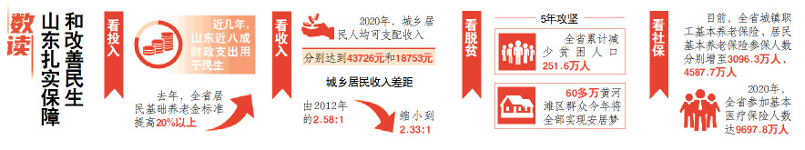 ——看社会保障。社会保险覆盖面不断扩大。目前,全省城镇职工基本养老保险、居民基本养老保险参保人数分别增至3096.3万人、4587.7万人;2020年,全省参加基本医疗保险人数达9697.8万人,位居全国第3位。60周岁以上老人不分国籍、不分地域,在山东一律享受免费乘坐城市公共交通工具等6项政策。