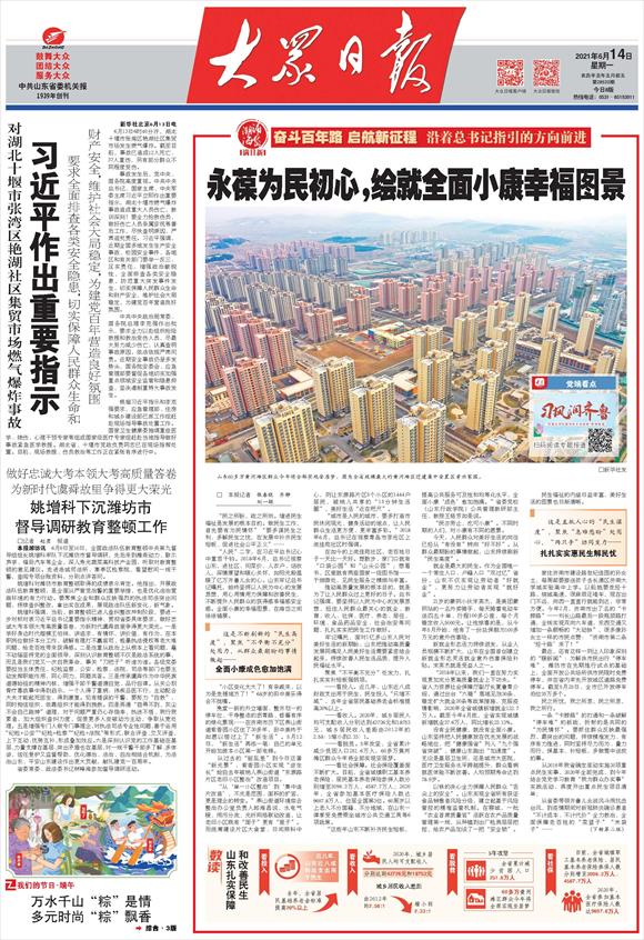 “人民”二字,在习近平总书记心中重若千钧。2018年6月,总书记视察山东,进社区、问菜价,入农户、话收入,深情厚望和暖心关怀,如阳光般温暖了亿万齐鲁儿女的心。山东牢记总书记嘱托,始终坚持以人民为中心的发展思想,用心用情用力保障和改善民生,不断提升人民群众的获得感幸福感安全感。全面小康的幸福图景,在海岱之间徐徐铺展。