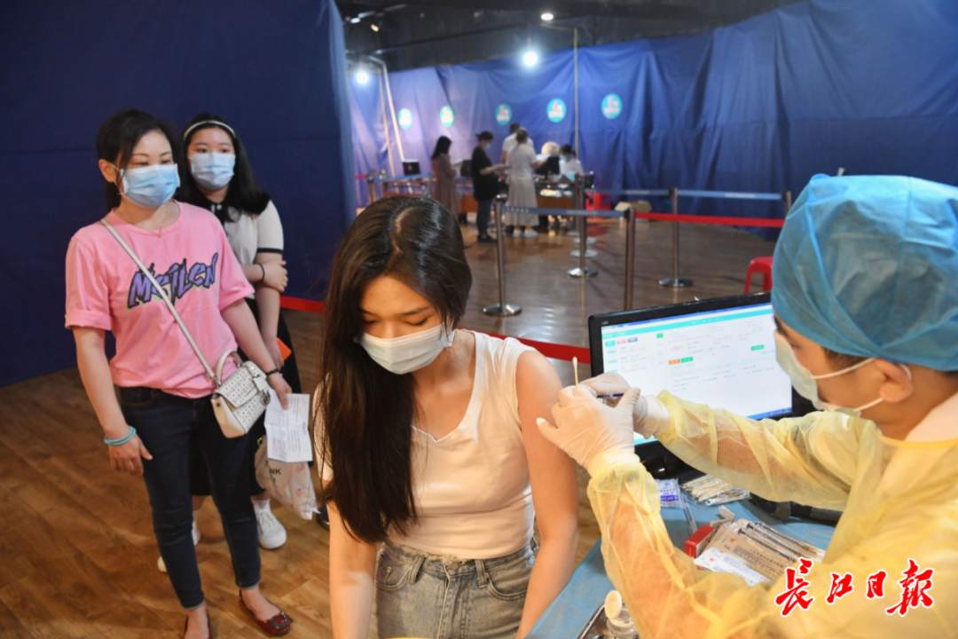 6月18日,江汉区花楼水塔街新冠疫苗免费接种点,市民有序排队接种新冠疫苗。
