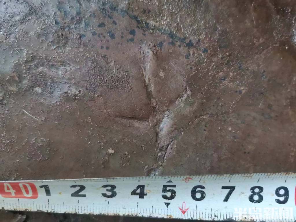庄文静介绍,除恐龙化石、恐龙蛋外,诸城目前共发现了3处距今1亿多年前的早白垩世时期的恐龙足迹化石点。“皇华沟恐龙足迹化石群是世界上规模最大的恐龙足迹化石点,最小的足迹在7厘米左右,而大的蜥脚类恐龙足迹直径超过80厘米,整个足迹群非常壮观,被称为‘恐龙舞蹈世界’。”庄文静介绍,目前发现的足迹化石多为恐龙直行足迹化石,而世界唯一的恐龙180度拐弯足迹化石,是在诸城棠棣戈庄发现的。“这是一条体型较小的蜥脚类恐龙踩印出来的足迹。一般是直线行走,很少出现急转弯的情况。专家推测,它可能遇到了难以跨越的障碍或者危险,才进行了180度的转弯。”一个、两个、三个……记者仔细数了数,行迹化石群上共有28个足迹,分布较为密集。很难想象到,体型庞大的恐龙,也有如此“灵活”之时。