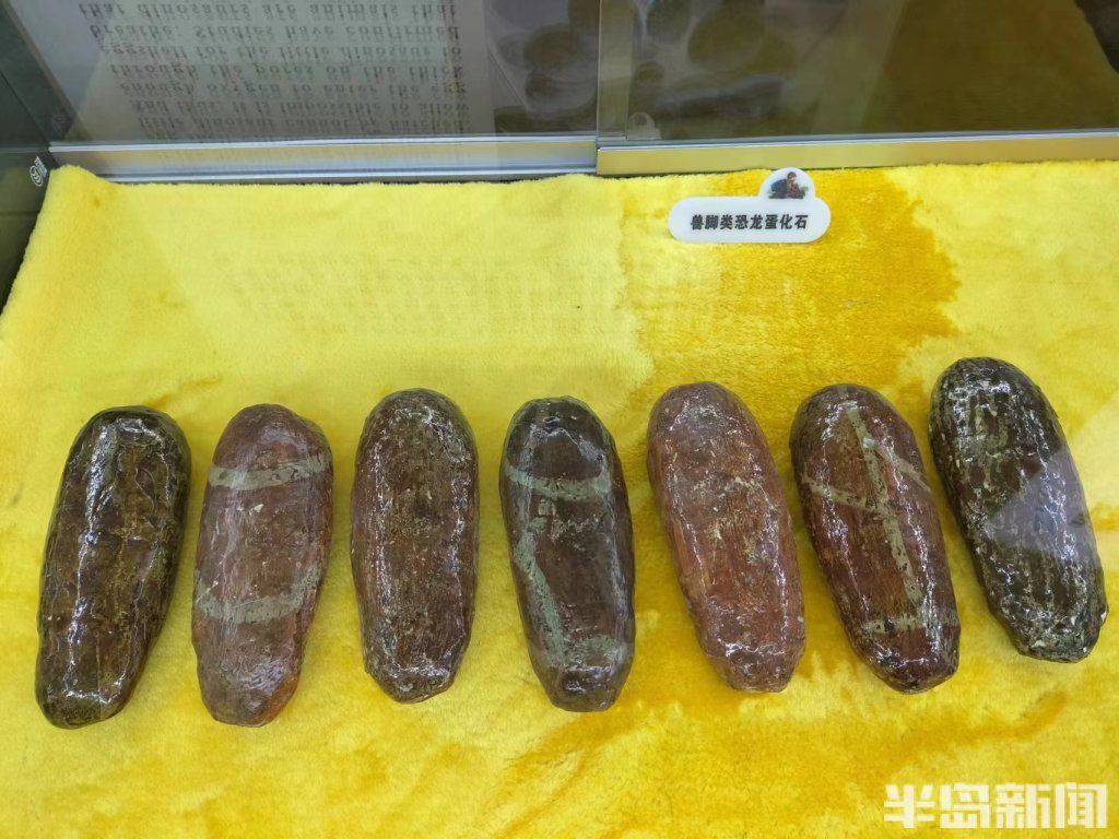 在恐龙蛋化石展厅,记者注意到,恐龙蛋形状各异,有椭圆形、长形、橄榄形等,大小也不一。展厅中间,一窝成对排列的恐龙蛋化石,恐龙蛋数量达到了几十枚。“一般来说,恐龙化石和恐龙蛋不会在同一地点发现,诸城是罕见的同时拥有恐龙骨骼化石、恐龙蛋化石和恐龙足迹化石的地区。”