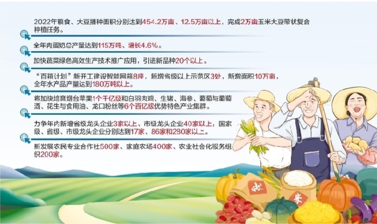 ●按照《意见》,今年,烟台将以农业产业化发展为突破口,聚焦农业稳产增产、农民稳步增收、农村稳定安宁,全力保障粮食和重要农产品有效供给,巩固拓展脱贫攻坚成果,扎实有序做好乡村发展、乡村建设、乡村治理重点工作,加快建设乡村振兴齐鲁样板示范市。