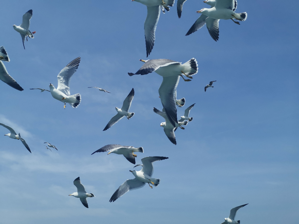 每天,从蓬莱开往长岛的客轮周围都会聚集着无数的海鸥。云蒸霞蔚,月涌江流,苍茫海天,沙鸥翔集是乘船前往长岛的每一位游人争相观睹的一道独特风景,与长岛的九丈崖、月亮湾、烽山林海、望夫礁一样,那些海鸥也很有故事,是长岛生活和叙事的重要部分。每年的五一十一长假,从蓬莱开往长岛的流水客轮旁边,每一艘刚刚驶离港口,那些海鸥就不知道从哪里忽然扎堆飞了出来,跟着客轮,跟着客轮边上站满的游人,鸣唱起了向海的歌。那个时候,齐鲁壹点、海报新闻、抖音视频每天都见那些游人与海鸥亲密无间,亲情戏水的视频和图集。