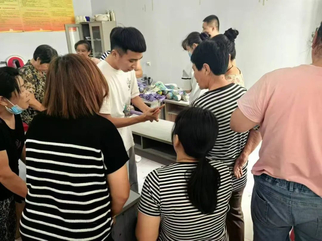 6月5日上午,端午节前夕,“抖音”直播刚开始没多久,手工艾草锤销售“热”力突然提升、供不应求。考虑到艾草锤的制作工艺特点,当即,双和管理区党总支协同“第一书记”张丙河决定,将手工艾草锤订单“下沉”至村庄,聘请专人开设专题培训班,免费提供原材料,进行“手把手”现场教学,陆续吸引了100余名党员、入党积极分子、群众报名参与。“真没想到这艾草全身都是宝,这下好了,咱们现在做这艾草锤,5毛一个、按件计费,平时抽空闲忙就能干了,也不影响照顾老人、小孩,在家门口就能挣钱养家了。”大房村村民张梅花笑着说。