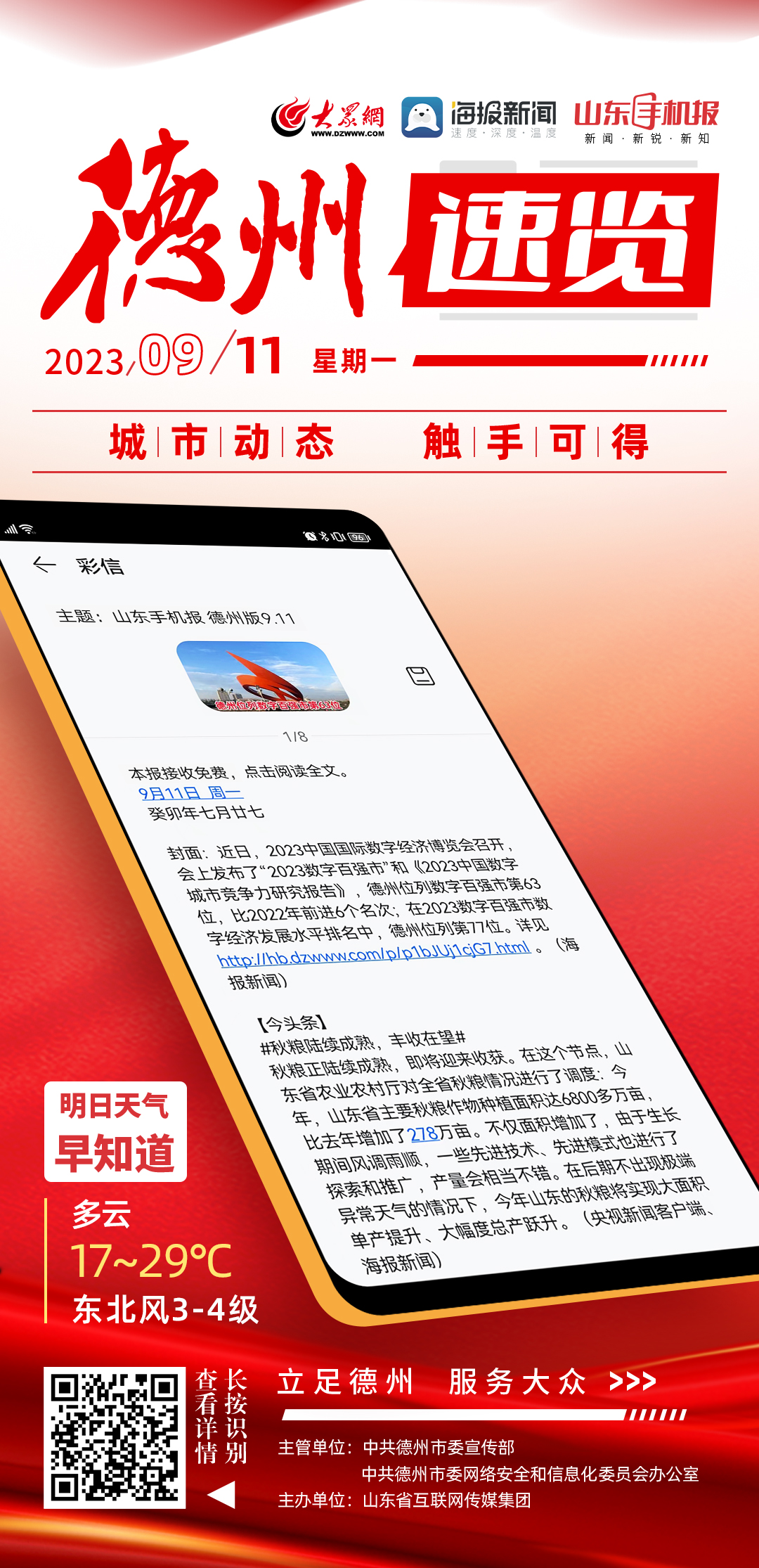 ▲近日,2023中国国际数字经济博览会召开,会上发布了“2023数字百强市”和《2023中国数字城市竞争力研究报告》,德州位列数字百强市第63位,比2022年前进6个名次;在2023数字百强市数字经济发展水平排名中,德州位列第77位。详见 http://hb.dzwww.com/p/p1bJUj1cjG7.html 。(海报新闻)