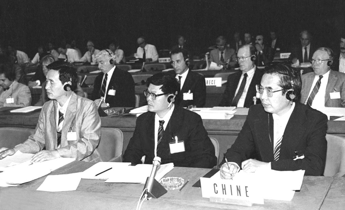 20世纪70年代,张明高(左)参加国际电联会议。