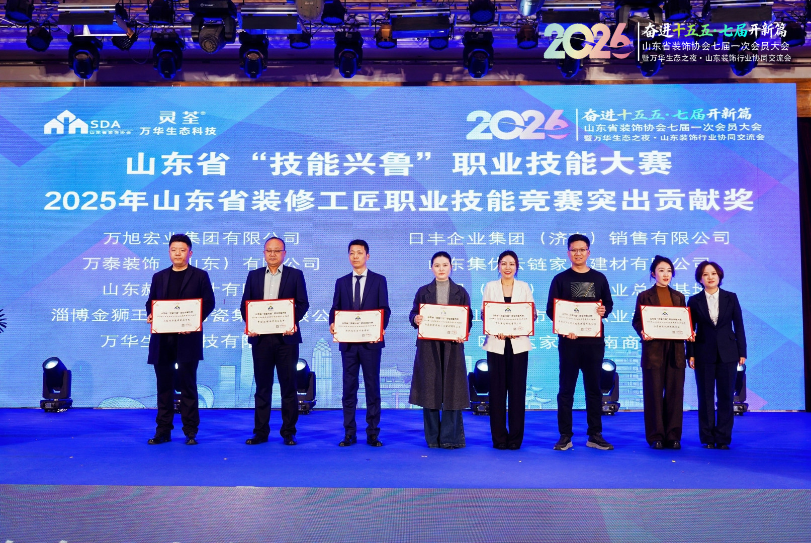 此次大会上,万旭宏业集团荣获山东省“技能兴鲁”职业技能大赛突出贡献奖,彰显了企业在行业技能人才培育领域的责任与担当。作为会长单位,集团将以此次大会为新起点,依托自身优势全力支持协会工作,主动扛起企业担当,携手行业同仁共促山东装饰行业高质量发展。