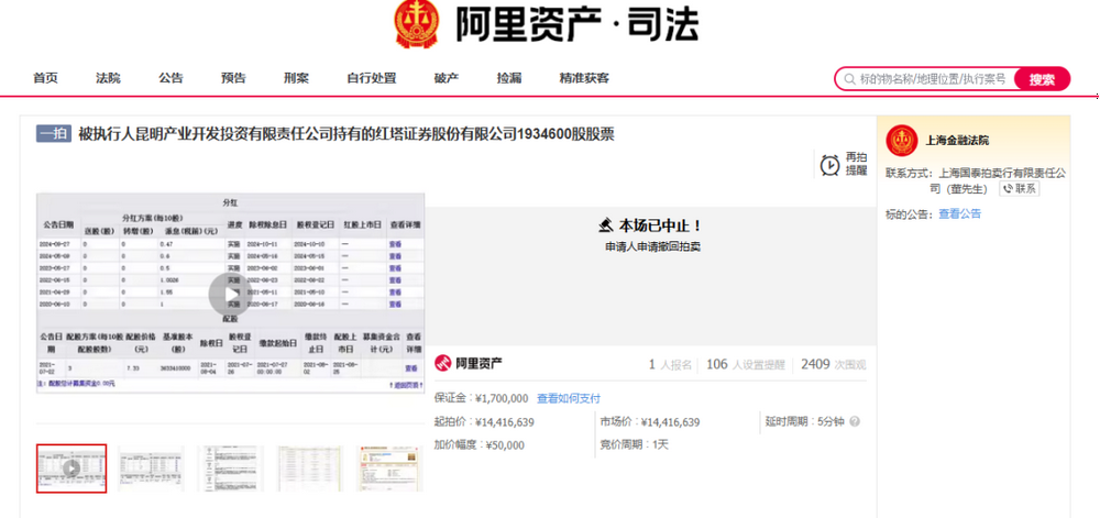 据阿里资产司法拍卖平台,昆明产投所持有的红塔证券193.46万股股票于2月16日10点上拍,竞拍周期为1天,起拍价为1441.67万元。不过,因申请人申请撤回,该场拍卖现为中止状态。截至发稿,该拍卖共引来2409次围观,106人设置提醒,1人报名。