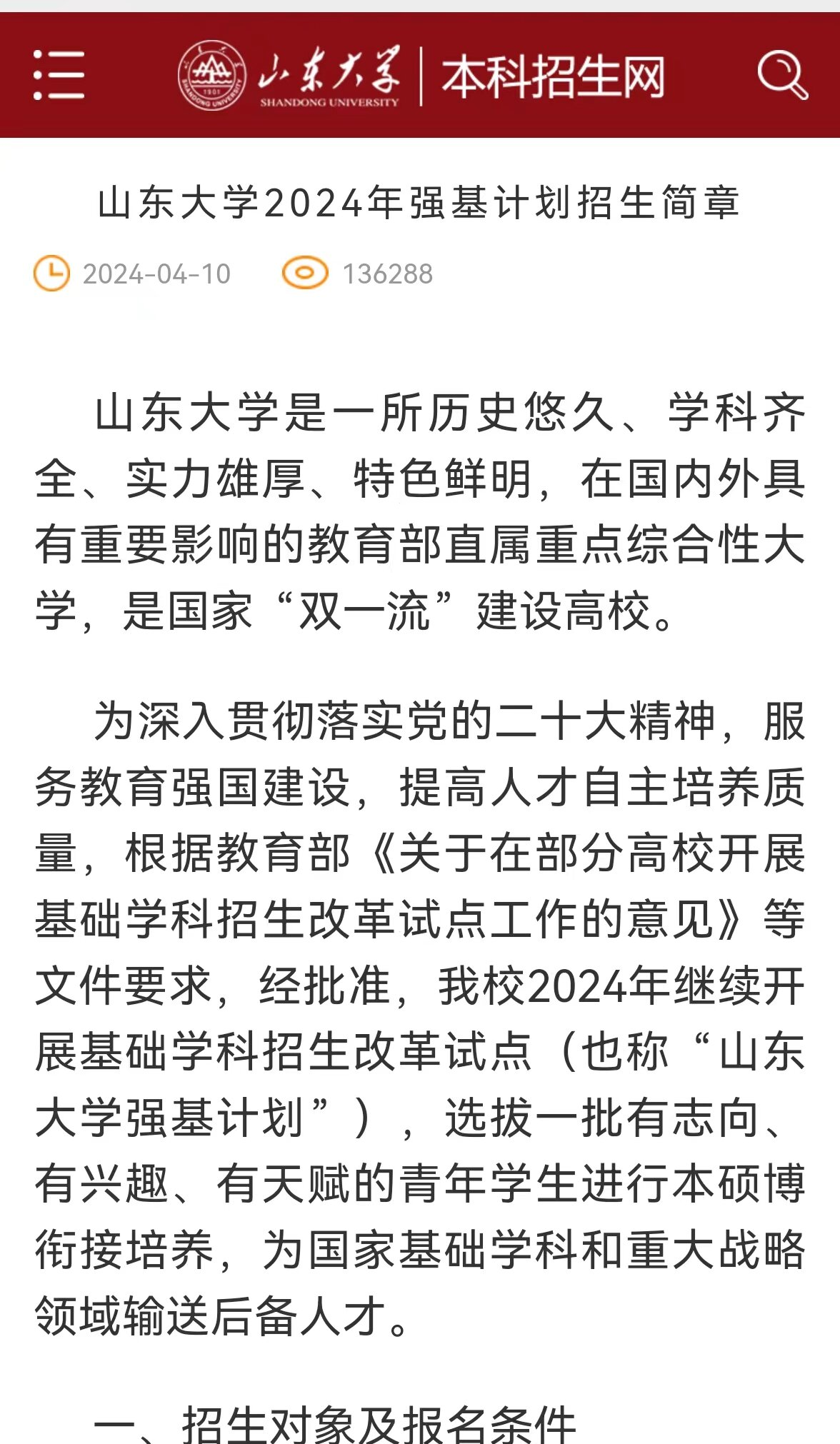 笔者查阅山东大学官网,在2024年强基计划招生简章中,分为两类情况,第一类:综合素质优秀、高考成绩(不含任何政策加分,下同)优异的考生。第二类:相关学科领域具有突出才能和表现,高中阶段在数学、物理、化学、生物、信息奥林匹克竞赛中获得全国决赛二等奖及以上奖励的考生。