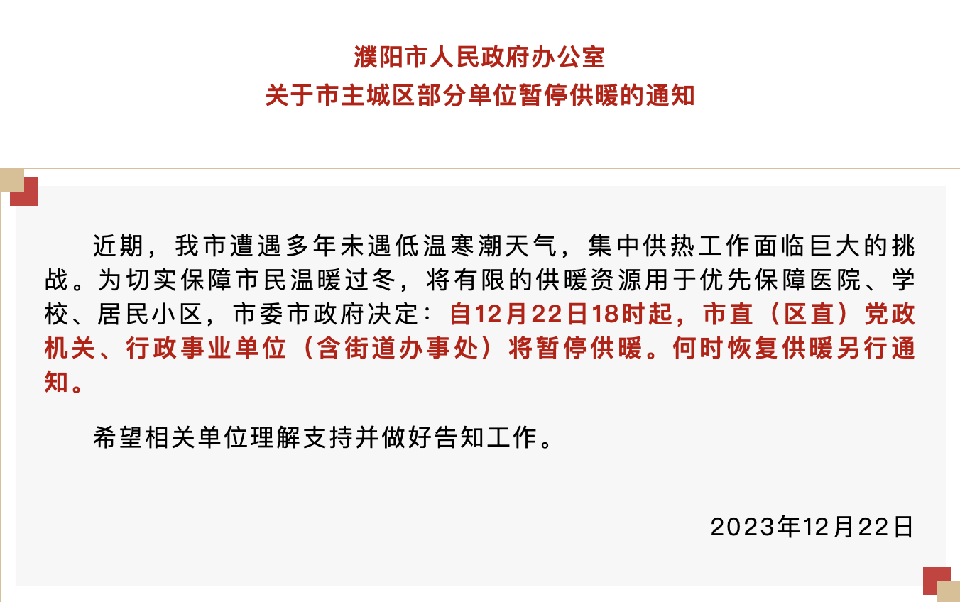 通知显示,近期,濮阳市遭遇多年未遇低温寒潮天气,集中供热工作面临巨大的挑战。为切实保障市民温暖过冬,将有限的供暖资源用于优先保障医院、学校、居民小区,濮阳市委市政府决定:自12月22日18时起,市直(区直)党政机关、行政事业单位(含街道办事处)将暂停供暖。何时恢复供暖另行通知。