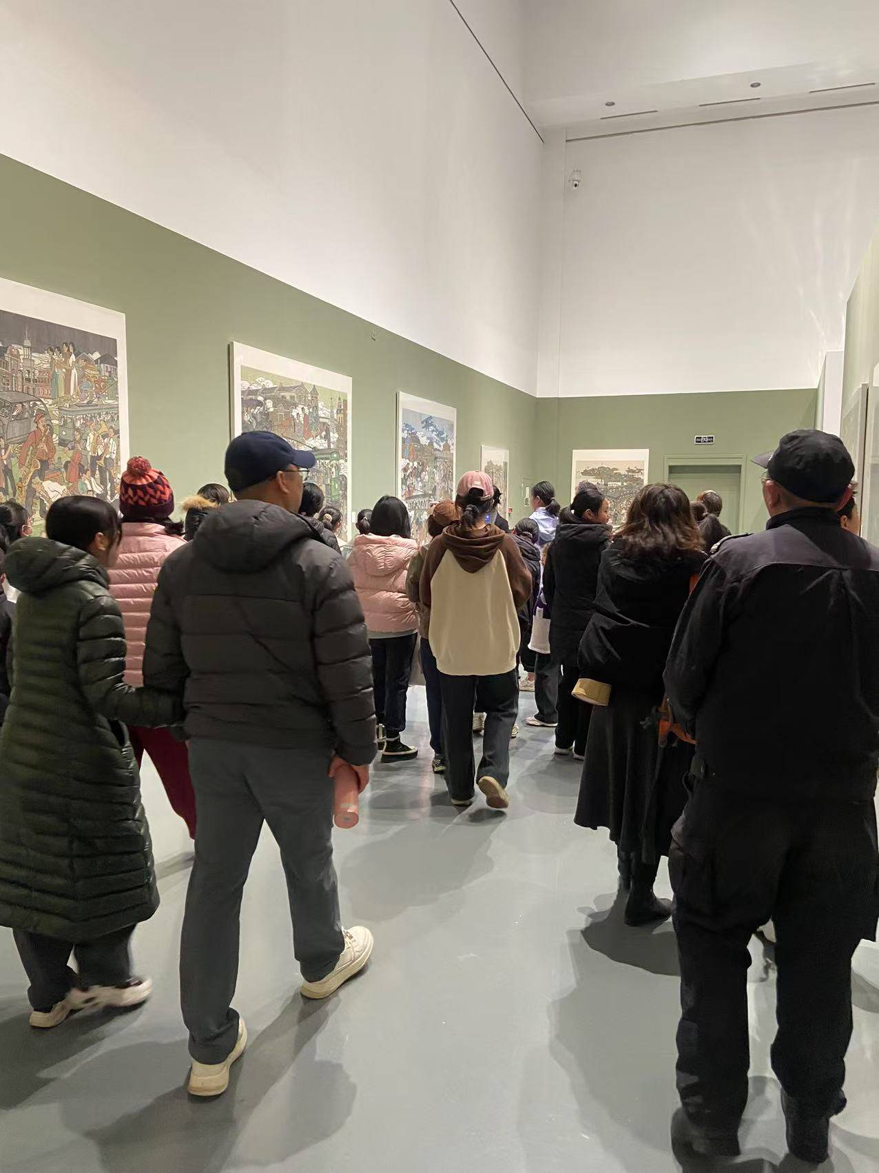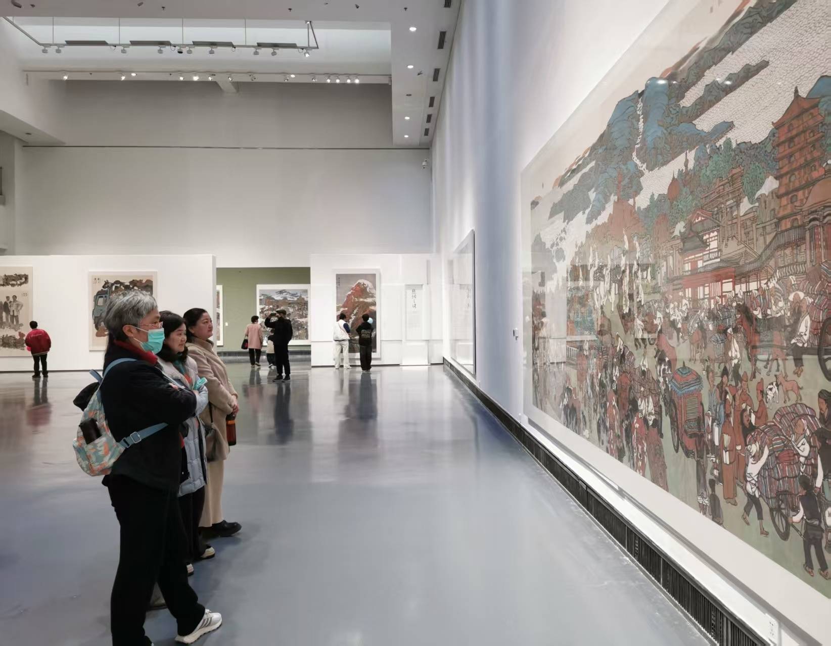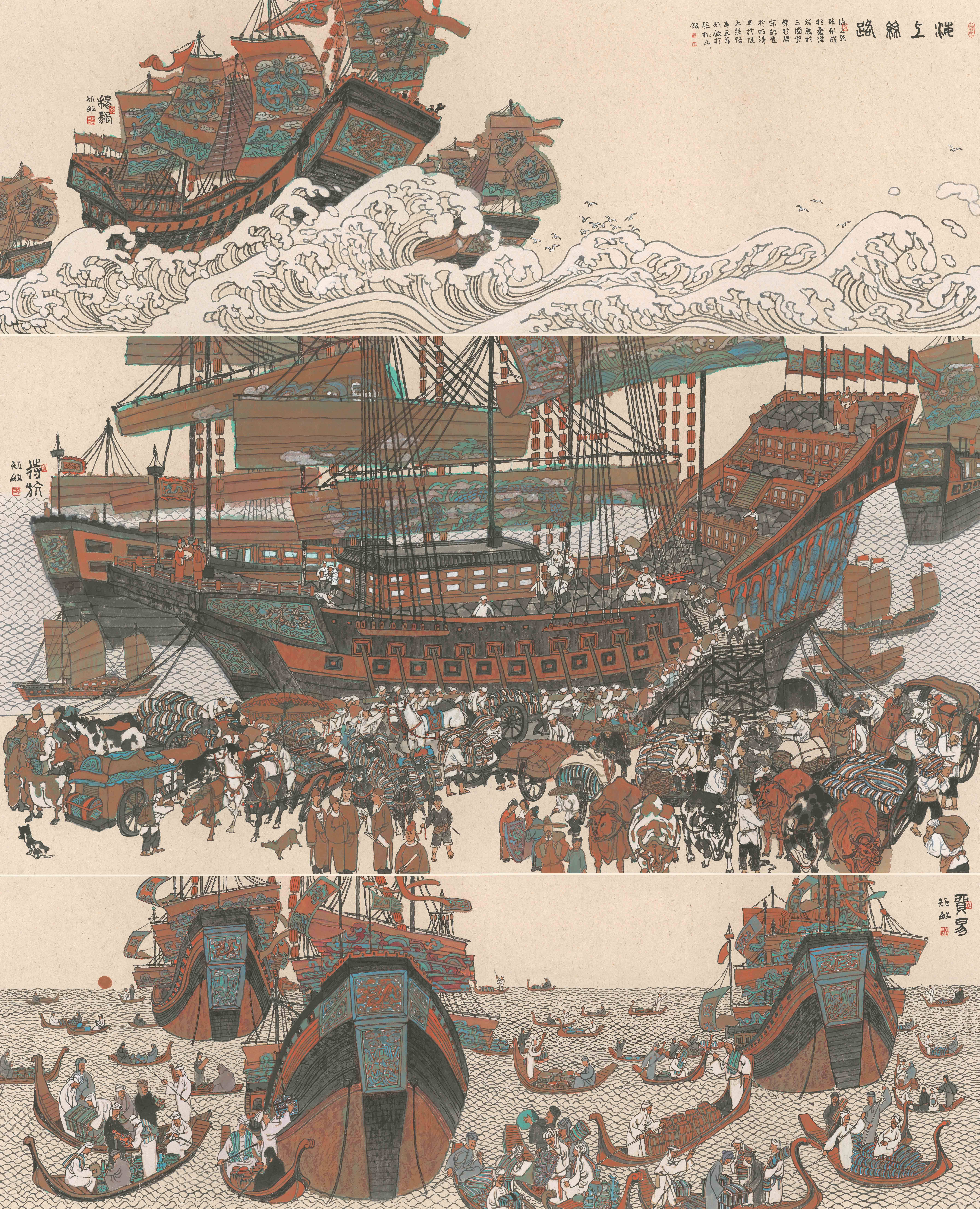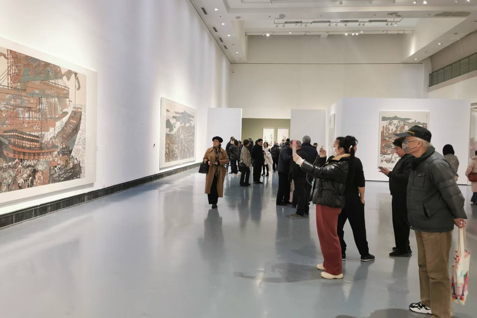 其中,《大先生》是周矩敏花了四年时间几经修改完成的人物肖像组画。所画人物皆是近现代具有家国情怀的文化名人,共画了150位,本次展出了其中的与苏州文化史相关的25位人物肖像画,在展现人物形象的同时,也展现他们的风骨与精神。《丝绸之路》借鉴了敦煌艺术和汉唐文化的意韵,开合转承间采用多视角多场景的组合手法,作品看上去更具视觉冲击力。《异域风情》包括写生画和印象画。其中,写生画以中国画的笔墨为基础,结合西画色彩表现外国风光;印象画用略带夸张变形的物象随性组合,将主题国地理图形作为背景,描绘出该国典型风情特征的物象,极具当代艺术特征。《园林人物》作为周矩敏画作的个性化代表,其艺术风格早被世人熟知。而《海上尘烟》则是作者带有实验性的一次探索,画面打破了时空界限,把互不关联、大小不一的人物与场景打散后重组。“这些画面极具张力,给人无穷的想象,丰富、耐看,有很强的带入感。”现场参观者洪良成对这样的画面充满好奇。
