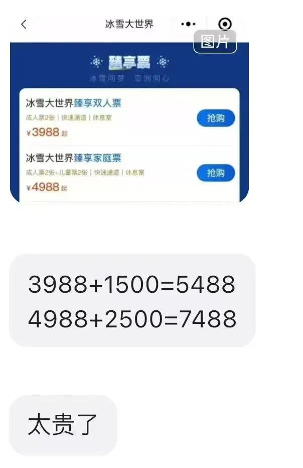 从门票销售情况也能看该景点的热度之高。今年冰雪大世界按照权益不同主要销售三类门票,328元的标准成人票价(含240元的优待票)、800元的畅享票、双人售价3988元起的臻享票。