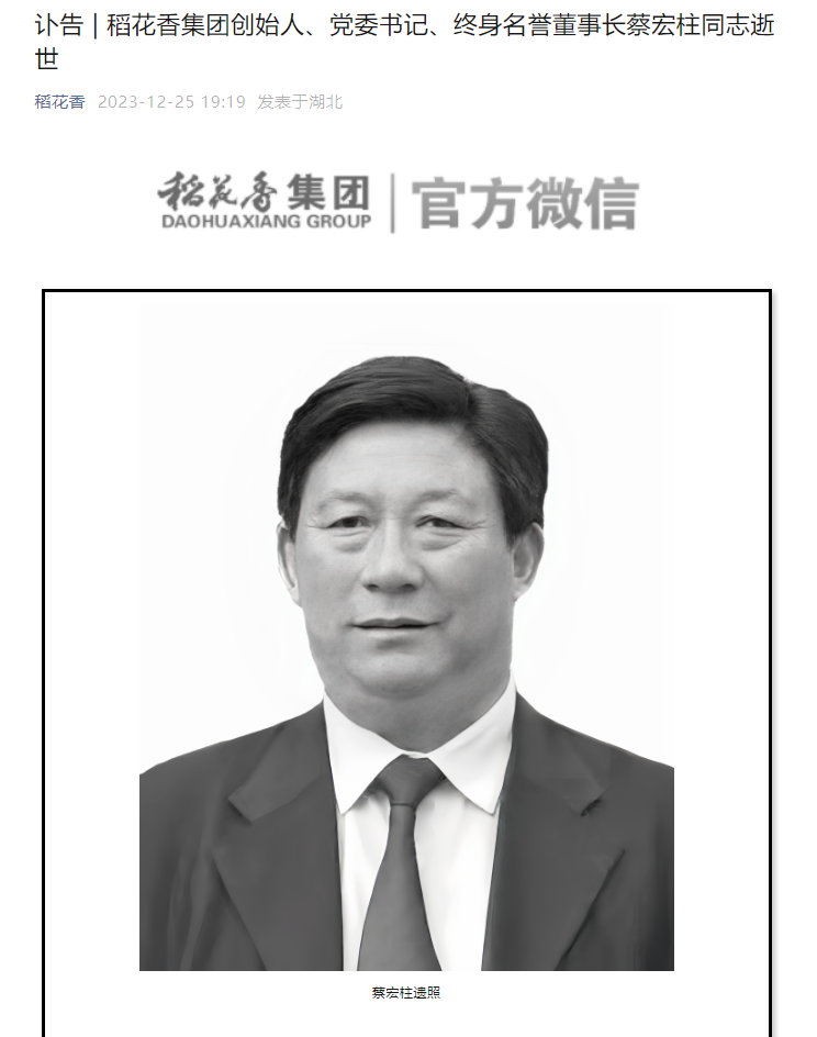 据稻花香集团官方微信公众号,稻花香集团创始人、党委书记、终身名誉董事长蔡宏柱,因病医治无效,于2023年12月24日19时30分逝世,享年73岁。记者注意到,稻花香集团官网首页、官方微信和官方微博头像都已经变成黑白色。