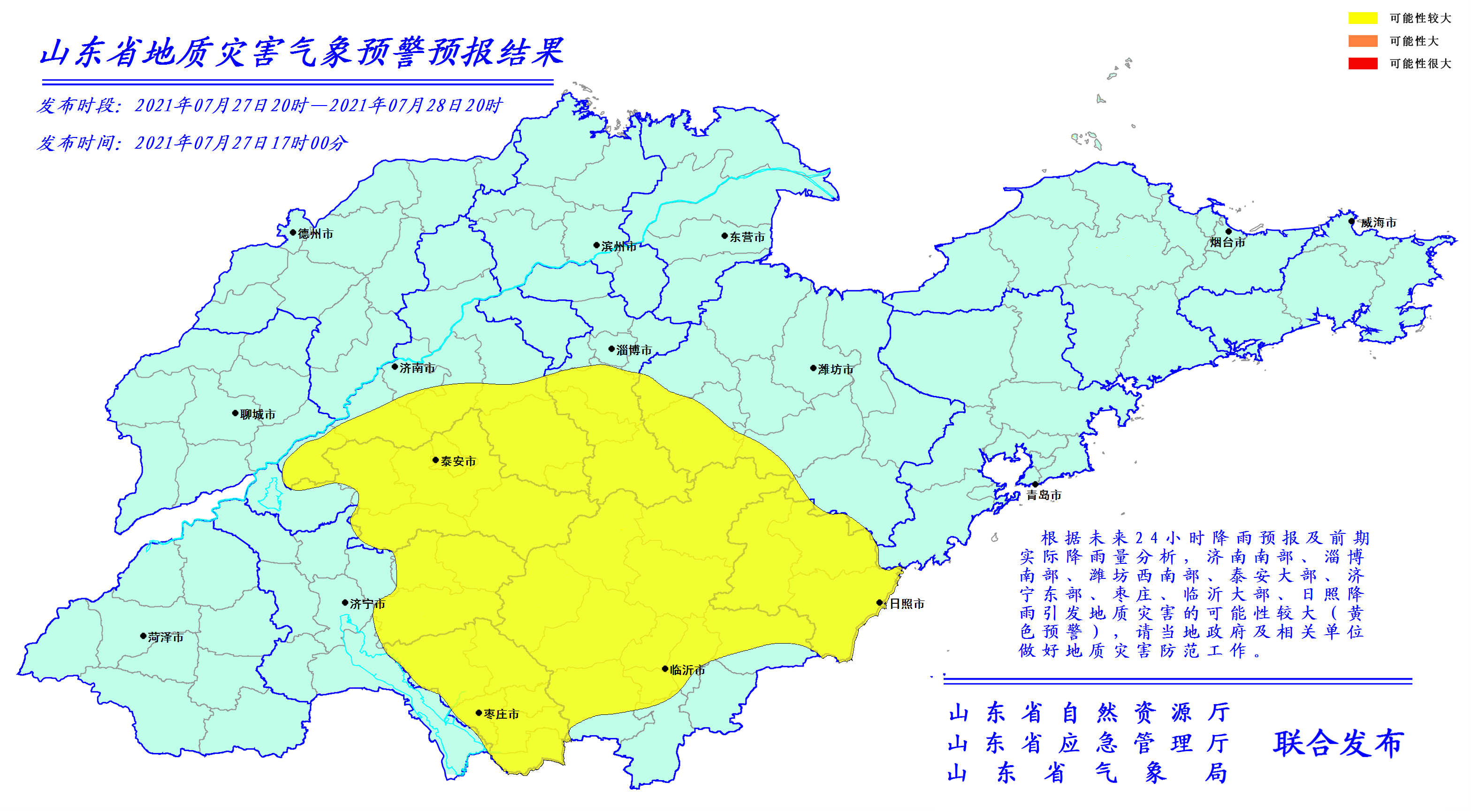 7月27日,记者从山东气象局了解到,根据台风“烟花”最新预报和未来24小时降雨预报及前期实际降雨量分析,山东省自然资源厅、山东省应急管理厅、山东省气象局7月27日17时联合发布地质灾害气象风险预警,济南南部、淄博南部、潍坊西南部、泰安大部、济宁东部、枣庄、临沂大部、日照降雨引发地质灾害的可能性较大(黄色预警),请当地政府及相关单位做好地质灾害防范工作。