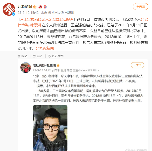 王宝强前经纪人宋喆疑已出狱,此前因犯职务侵占罪被判处有期徒刑六年