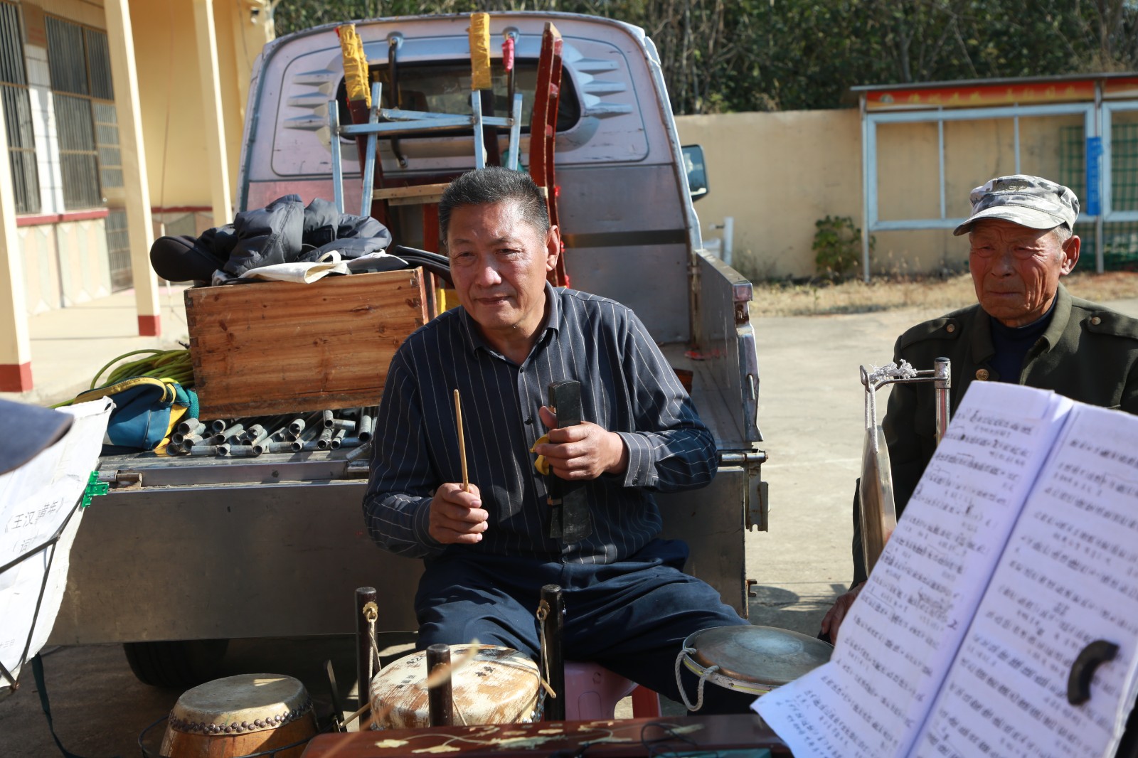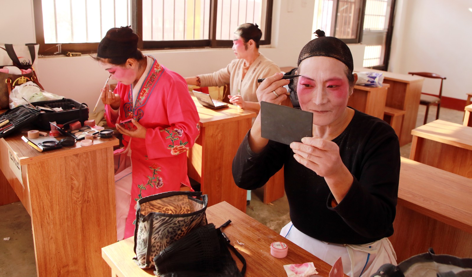 为做好当天的演出,演员们早早赶到土山岭村党群服务中心,在室内浓妆艳抹,精心梳妆打扮。而负责器乐表演的“60+乐队”,则一遍遍的排练磨合,丰富舞台效果。