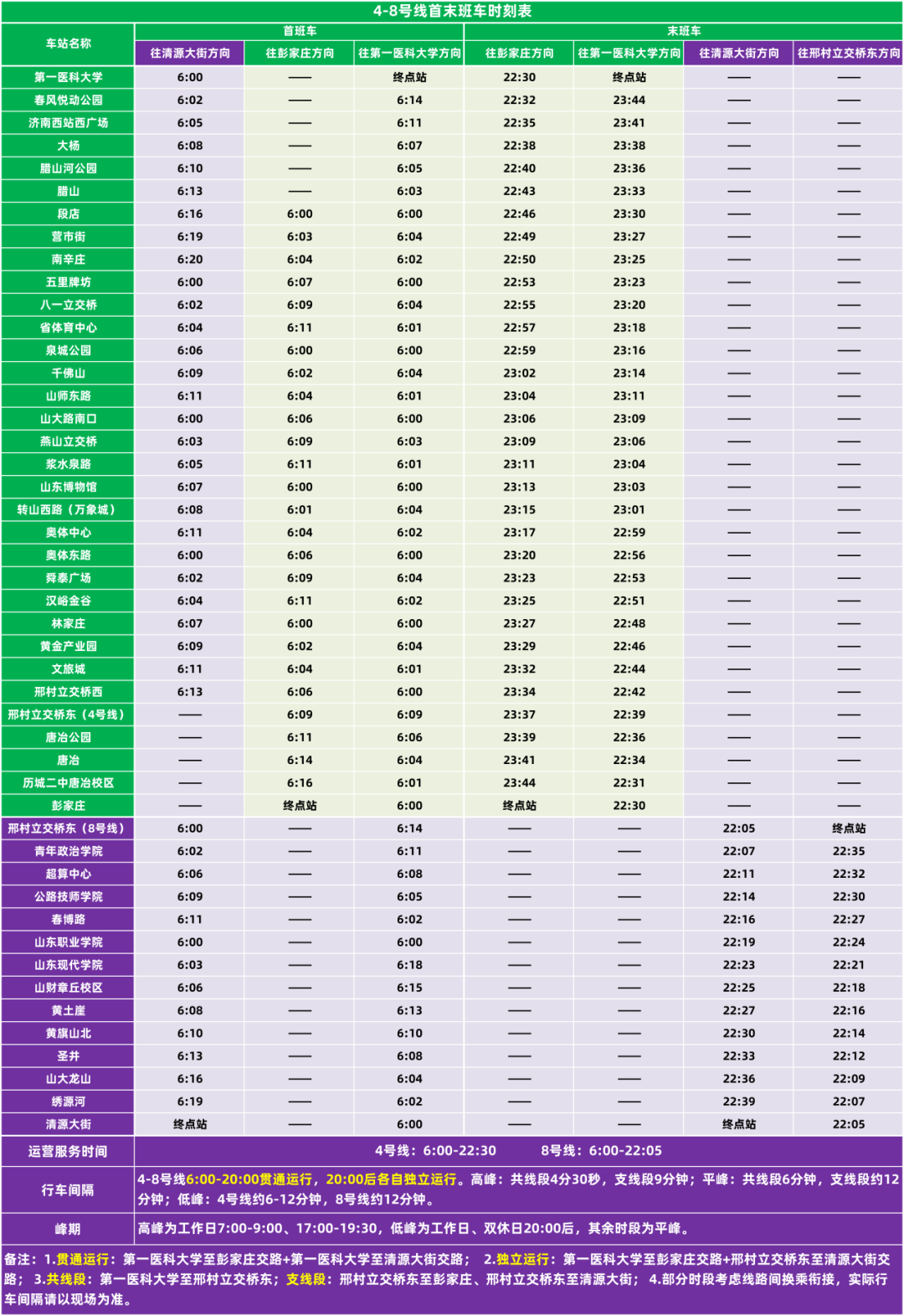 列车自第一医科大学站出发,经共线段(即第一医科大学站至邢村立交桥东站)运行,随后分为两个支线:邢村立交桥东站至彭家庄站邢村立交桥东站至清源大街站。6:00至20:00(第一医科大学发车时间)时段内,采用贯通运行方式。工作日高峰时段共线段行车间隔4分30秒、支线段9分钟;平峰时段共线段行车间隔6分钟、支线段约12分钟。20:00至运营结束,采用独立运行方式(即4号线为第一医科大学站至彭家庄站往返独立运行、8号线为邢村立交桥东站至清源大街站往返独立运行)。4号线行车间隔约6-12分钟、8号线行车间隔约12分钟。双休日行车间隔与工作日平峰低峰时段一致。