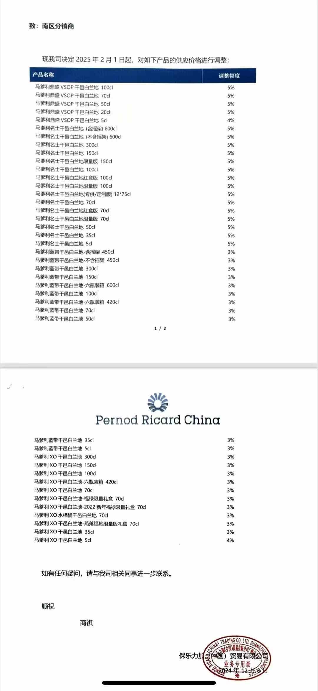 该通知宣布,自2025年2月1日起,保乐力加将对马爹利品牌下的多款产品供应价格进行上调,涉及范围广泛,包括马爹利鼎盛VSOP干邑白兰地100cl、马爹利名士干邑白兰地600cl、马爹利蓝带干邑白兰地450cl等在内的共计42款产品,其价格涨幅将介于3%至5%之间。