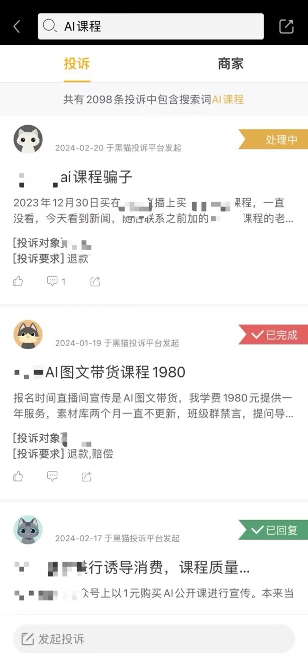 在黑猫投诉平台,记者以“AI课程”为关键词搜索,平台关于AI课程的投诉有2000多条,其中用户举报诱导消费的占比很高。