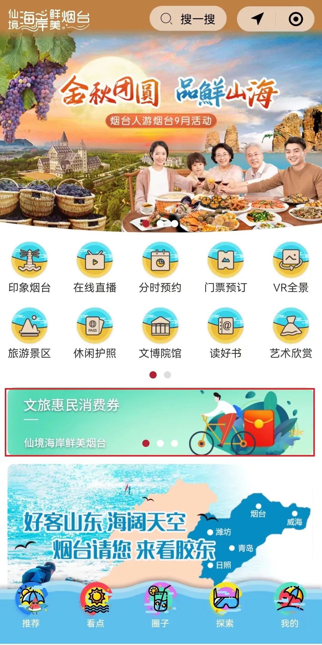 消费者可通过搜索“烟台文旅”公众号,或搜索“烟台文旅云”小程序抢券消费。欢迎市民游客积极参与“文旅金秋惠民消费月”活动,“约惠”国庆、重阳节,游仙境品鲜美,全民狂欢。