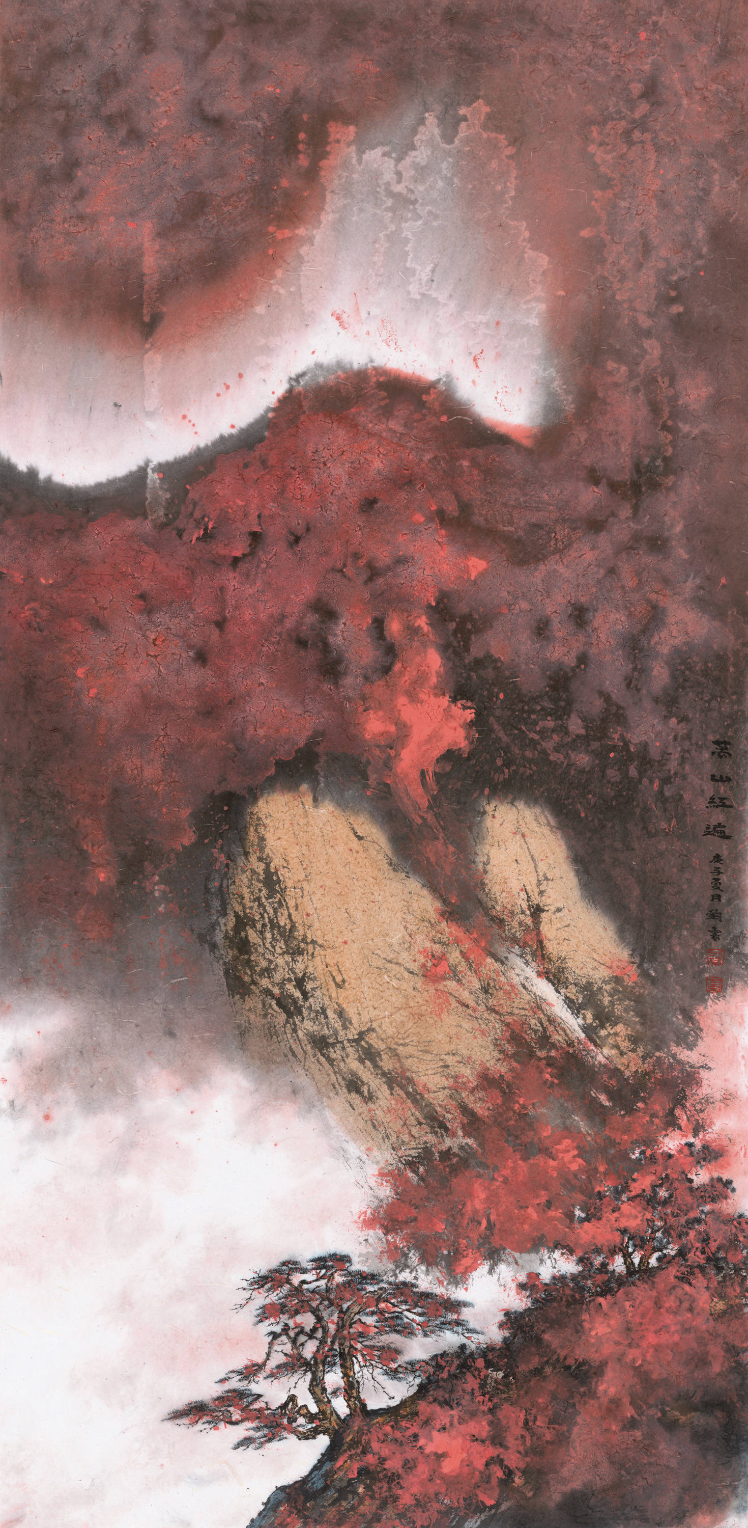 这幅《万山红遍》极具特色。从色彩运用上,大胆以浓烈的红色铺陈山峦,形成强烈视觉冲击,凸显出万山红遍的磅礴气势,同时红与灰白的云雾相衬,增添画面层次感与虚实变化。