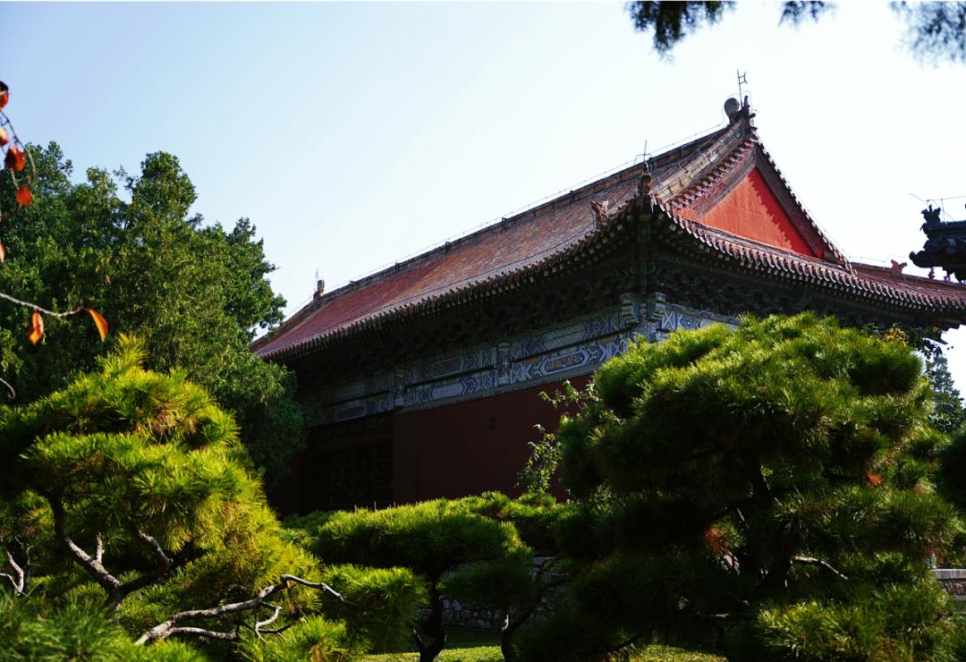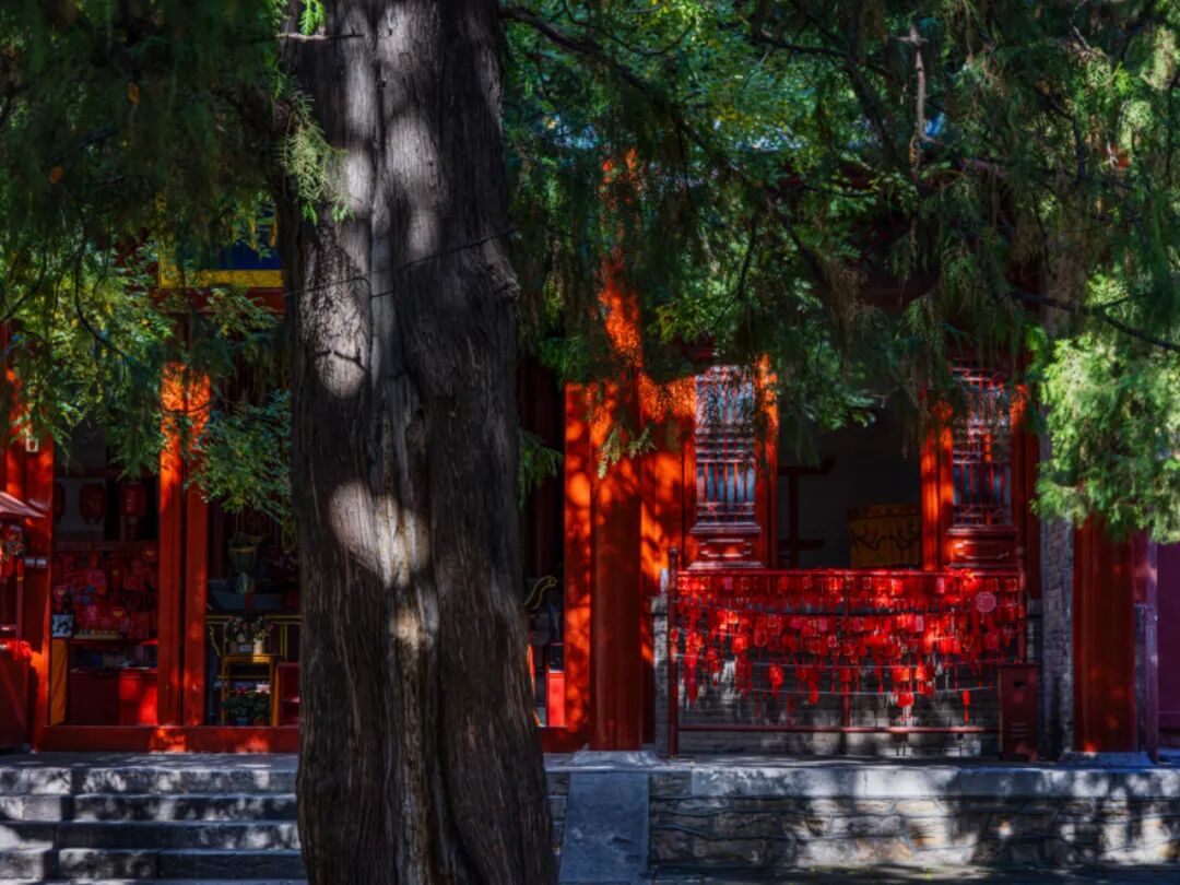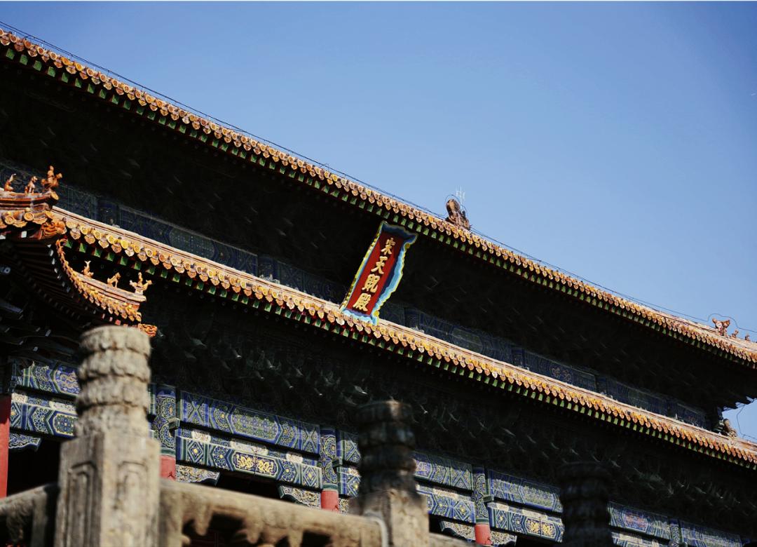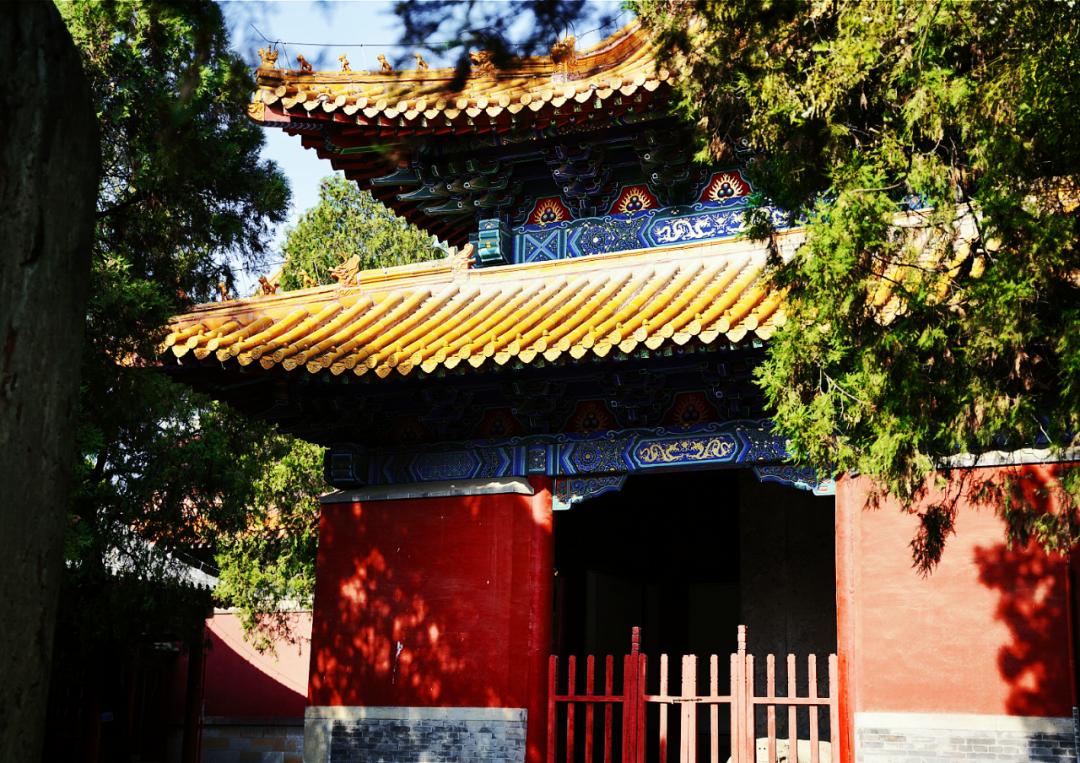 沿着中轴线前行,晨光与古建的绝美邂逅在眼前徐徐展开。天贶殿的飞檐翘角直指苍穹,檐角的瑞兽在晨光中轮廓分明,仿佛正要乘风而去。殿宇前的松柏舒展着枝桠,深绿的叶片间漏下暖阳,在地面投下斑驳的光影,随着风的流动轻轻晃动。香火缭绕中,身着素衣的游人缓步而过,低声细语,生怕惊扰了这份沉淀千年的宁静,这一幕里,古刹的庄严与初冬的柔美撞了个满怀。