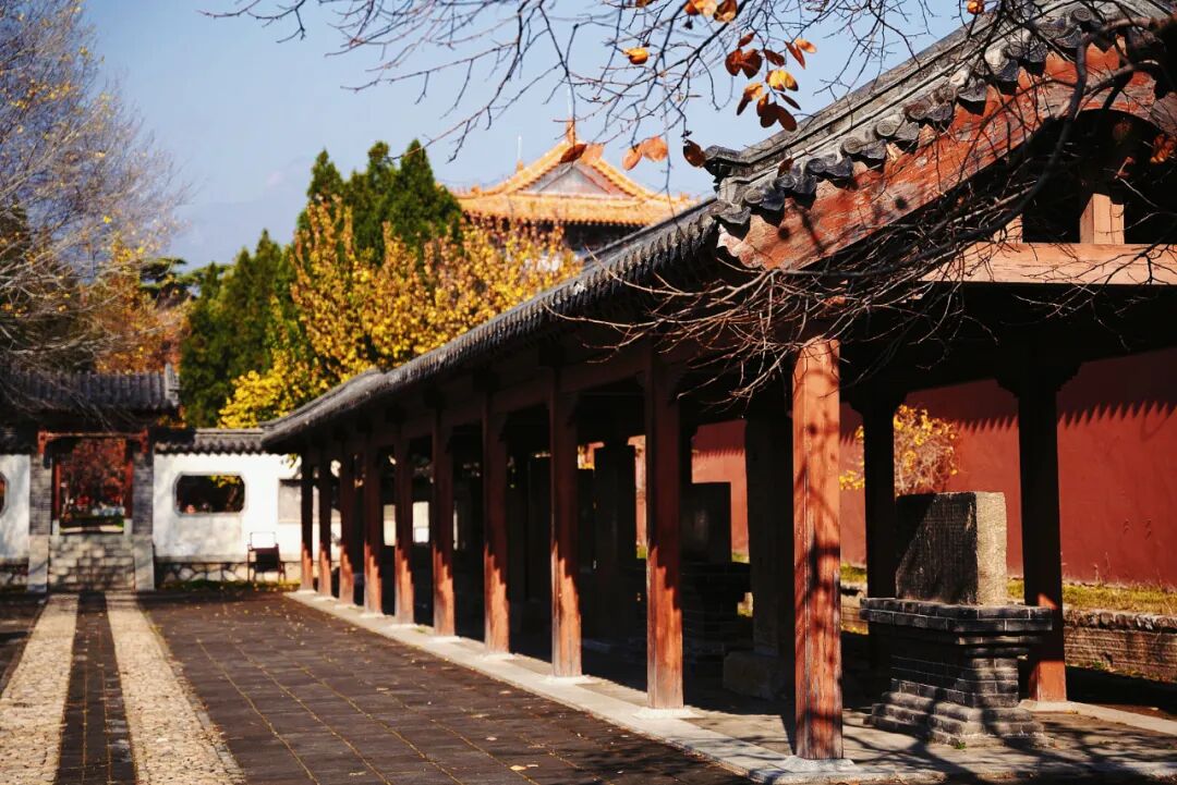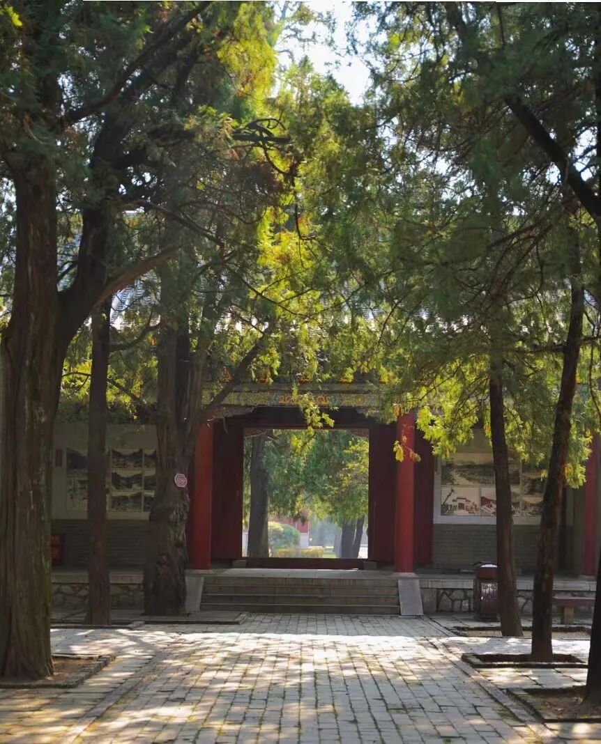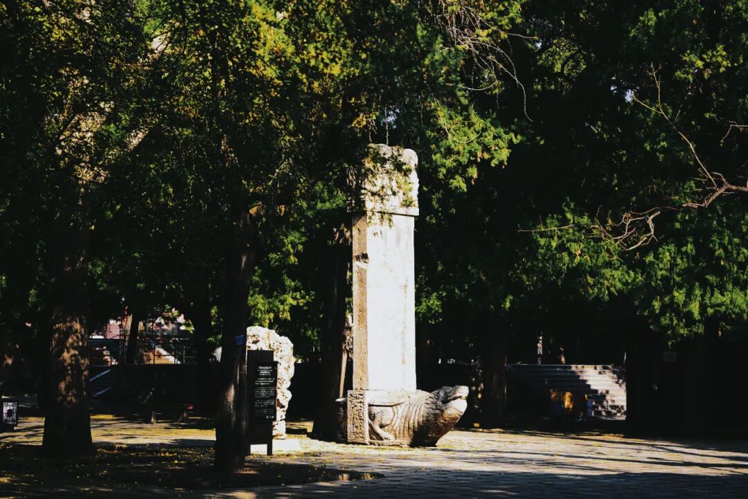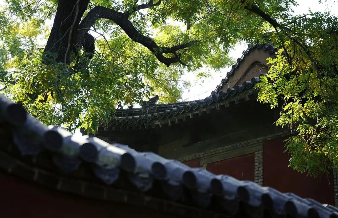 西侧的岱庙同样别有韵味。老槐树的枝干遒劲舒展,虽有部分叶片泛黄,却依旧透着生机,与院中的碑刻相映成景。石碑上的字迹历经风雨侵蚀,更显古朴厚重。晨光洒在碑文中,每个笔画都仿佛被赋予了生命,诉说着岱庙的千年故事。视线缓缓移动,从碑刻的纹路到槐树枝丫,从墙角的青苔到石阶上的细尘,每一处细节都藏着初冬的诗意。