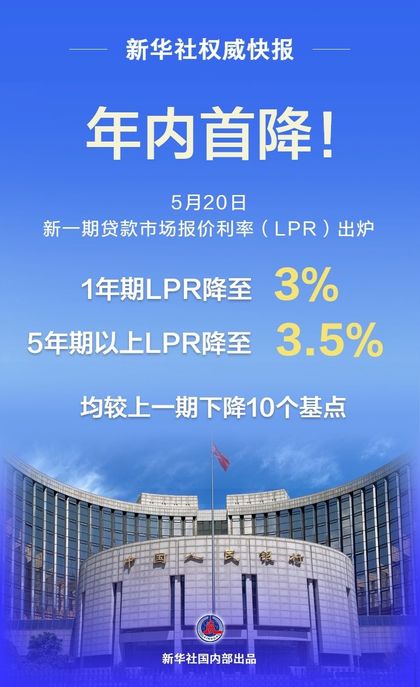 1年期LPR降至3%,5年期以上LPR降至3.5%