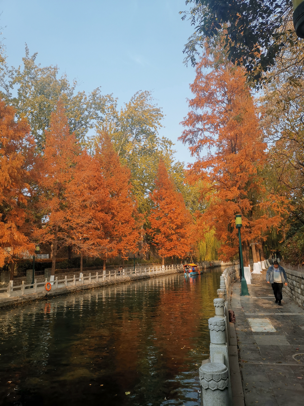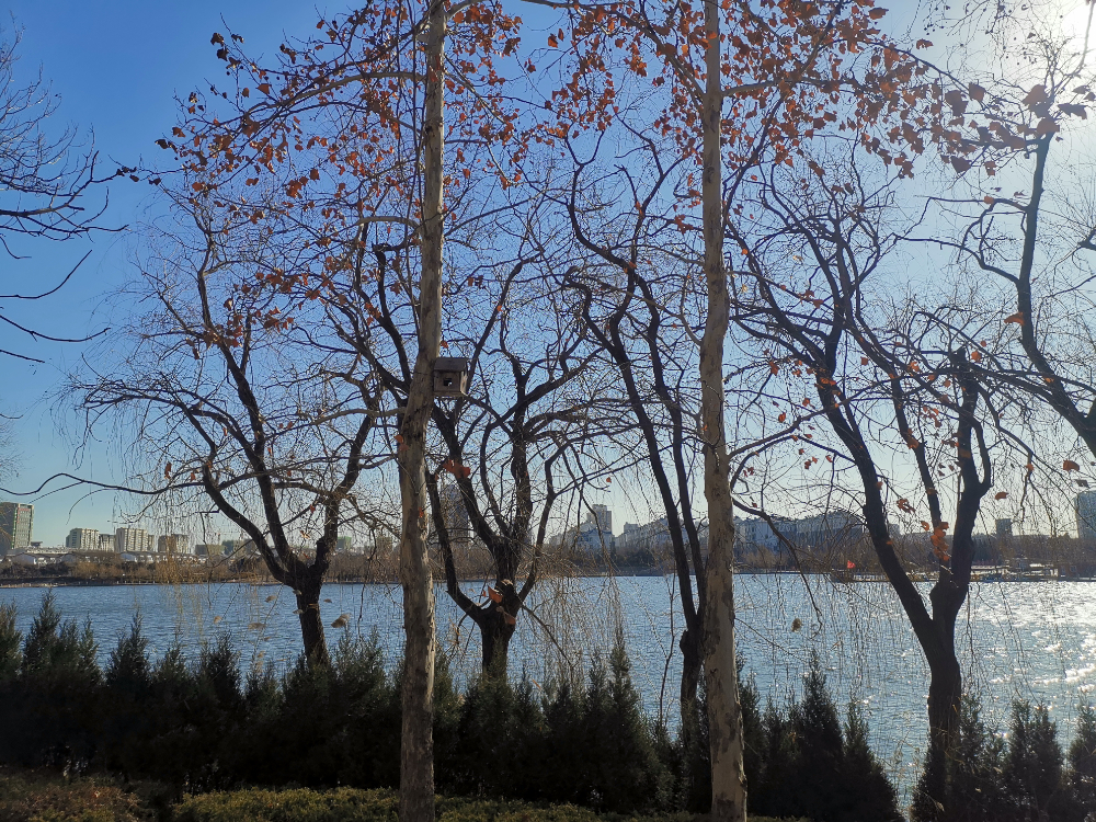 我到护城河畔也是为了寻找一个站立的冬天。那天,我在护城河畔照例看到了那些红枫和水杉。一棵红枫的叶子在阳光里正红得烂漫,红得夺目。每年的冬天,当红叶谷和别的地方红叶落尽,护城河畔的红叶还正处在它们最高光的时刻。记得去年,我在锦绣川和护城河畔的这片枫叶林都摘过一些红叶,回家后夹在了书架的书中,每每掀开书页,看到那些红叶,仿佛就看到泉城霜叶红于二月花的情景铺面而来。从来泉城我每年的秋冬都会摘几片红叶放在书中,时光送走了流年,红叶留下了我对这个城市最有底色的回想和记忆。那天,在护城河畔,我到去年摘过红叶的一棵红枫那里,正有红得灿烂的几枚红叶要落下,我轻轻摘了下来,回家还储存在我的册页中。十年如一日,我早已过了天命之年,这棵护城河畔的红枫依然如约站立在护城河畔,站立在泉城的冬天里,这样的等待和守望总让人心中充满了浓浓的暖意。