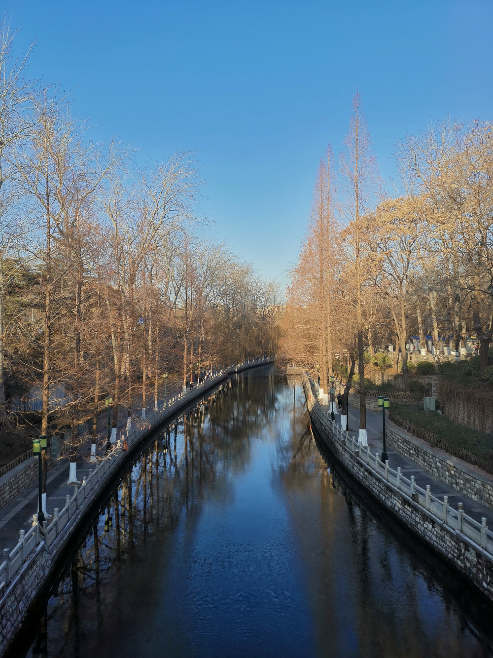护城河畔也有一片和泉城公园,五龙潭一样的水杉林。那些水杉林从春天开始就是绿满泉城不可或缺的一部分,那种绿的纯粹,绿的盎然,每次都会给行走之间的人说不尽的清爽和愉悦。所有的美图和视频都无法刻画在葳蕤和玲珑中展示的那种生命的勃勃生机。冬天来临,那些绿仿佛一夜之间就远遁而去,消失得无影踪。生命的图腾以另一种形态在泉城的冬天继续演绎着与众不同的传奇。那些水杉都很高很挺拔,在夏天里,绿色涨满的时候,她们铺散着,把天空的蔚蓝都遮掩了,把站立留给了下面的空间,阳光会从那些阴翳中透射到林中,斑斑点点,影影绰绰。冬天,绿色隐去,叶子落尽,那些水杉换了一身轻便的装束,高高地耸立在护城河、泉城公园和五龙潭边。阳光可以恣肆漫漶地与那些水杉交头接耳,蔚蓝可以毫无遮掩地在水杉和水中挥洒—高高的站立曾经是一种姿态和背景,如今,过往的锦绣繁华成为浮光掠影,在冬天站立的那些水杉成了这个城市最健硕的精神和风骨。