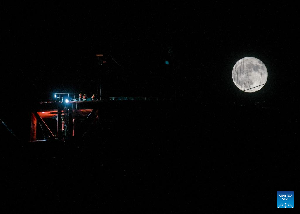 Constructors work on the Machanghe grand bridge along the Guiyang-Pingtang Expressway in southwest China's Guizhou Province, Aug. 20, 2024. The main arch of the Machanghe grand bridge along the Guiyang-Pingtang Expressway was successfully joined on Wednesday. The bridge has a length of 381.5 meters with an arch spanning 260 meters. (Xinhua/Yang Wenbin)