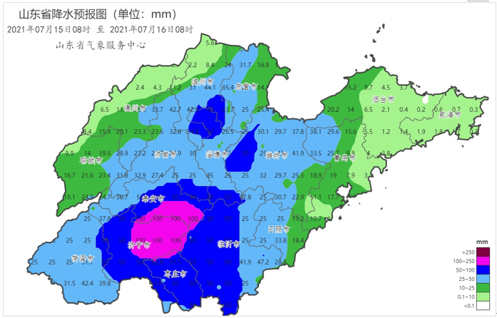 2021年7月15日08时至16日08时山东省降水预报图(毫米)