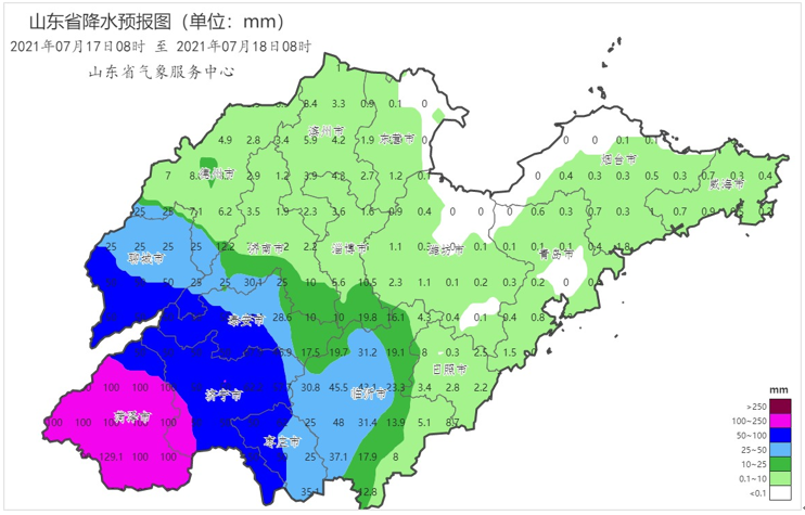 2021年7月17日08时至18日08时山东省降水预报图(毫米)