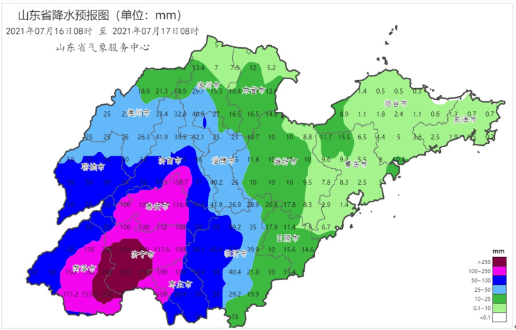 2021年7月16日08时至17日08时山东省降水预报图(毫米)
